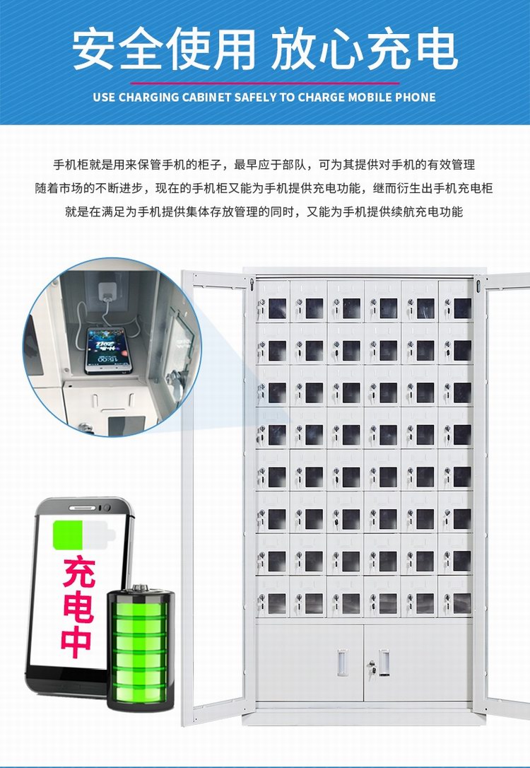 手機(jī)保密柜正面為對(duì)開金屬邊框玻璃大門,便于觀察柜內(nèi)情況,堅(jiān)固透亮,美觀大方。